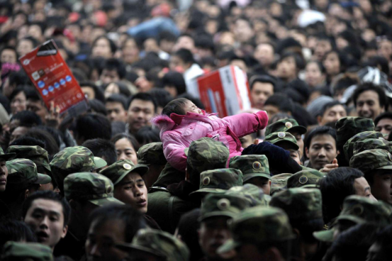 ↑2008年2月1日,武警戰(zhàn)士從廣州火車站密密麻麻的人群中把一個(gè)孩子手遞手托舉出來(lái)。新華社發(fā)