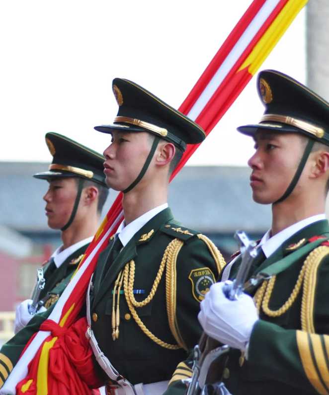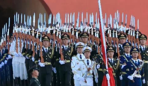 國旗護衛(wèi)隊在護送國旗走向升旗臺