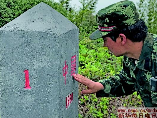 “第一次見到界碑時,特別激動,看到‘中國’二字,特別自豪!”在同伴的帶領(lǐng)下,蔡新裝用了半天時間爬到山頂,他快步上前,撫摸著碑身,擦拭著界碑上的字符,在擦拭“中國”二字時特別用心。然后仔細查看界碑周圍的情況,用砍刀修剪草叢,還用手機拍下一張界碑的照片。