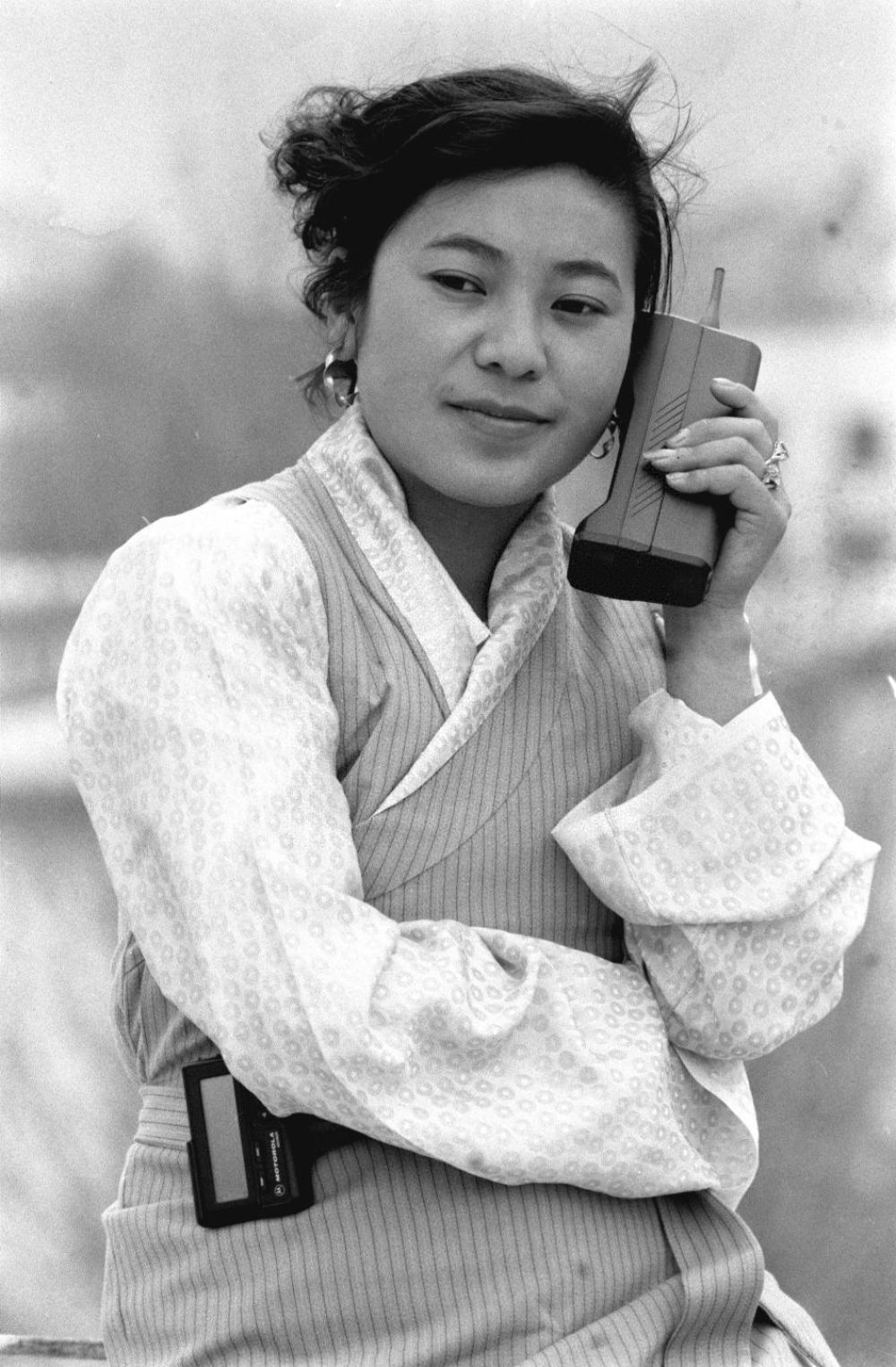 身穿喇叭褲,手持大哥大