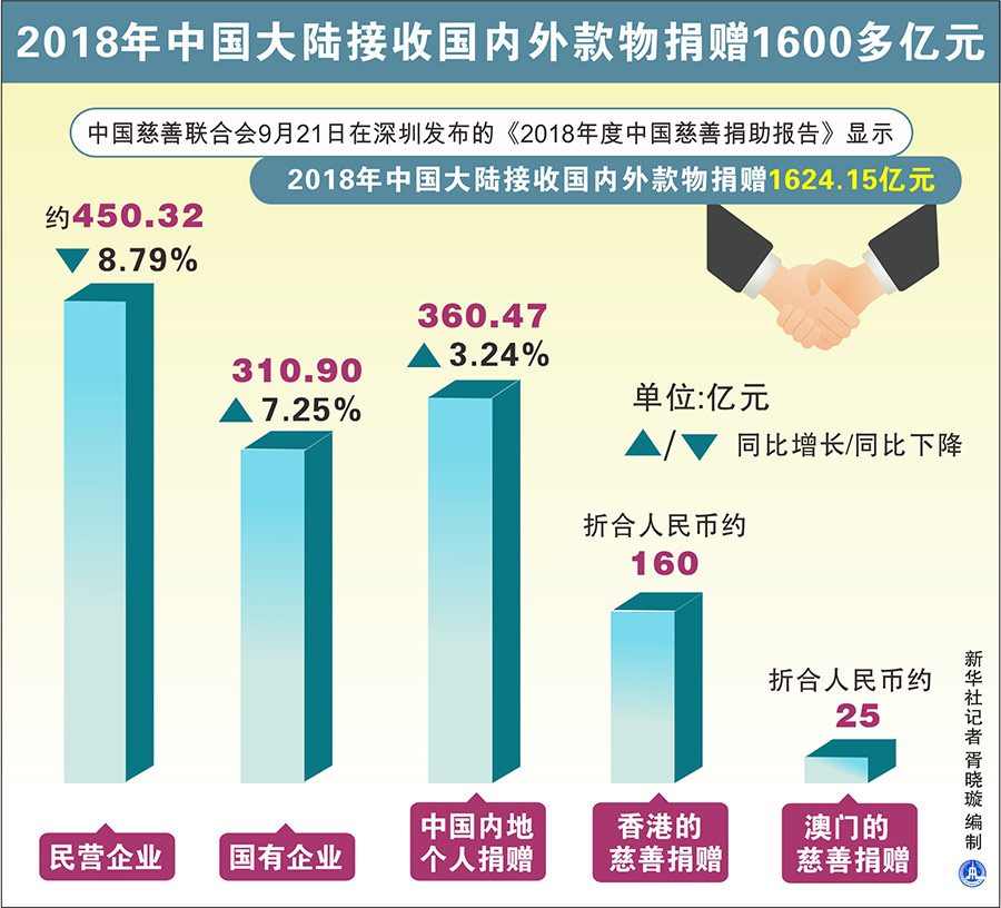 新華社深圳9月21日電(記者王豐、李曉玲)中國慈善聯(lián)合會21日在深圳發(fā)布的《2018年度中國慈善捐助報告》顯示,2018年中國大陸接收國內(nèi)外款物捐贈1624.15億元。