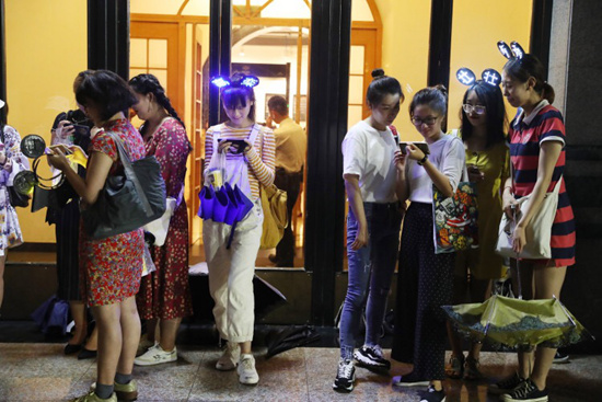 9月9日傍晚,天色尚未完全暗下,從車(chē)公莊西或者動(dòng)物園地鐵站下車(chē),你就能匯入一股神奇的人流。年輕女孩居多,提著沒(méi)來(lái)得及吃的快餐,手里拿著手幅和燈牌,頭上戴著閃光的發(fā)箍,三五成群地向北京展覽館劇場(chǎng)走去。