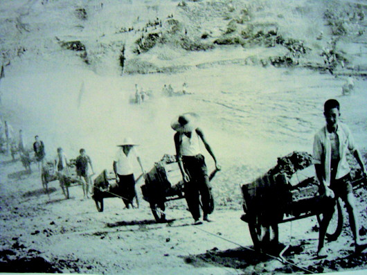 移民們靠著肩扛車拉改造大柴湖。湖北大柴湖教育基地提供