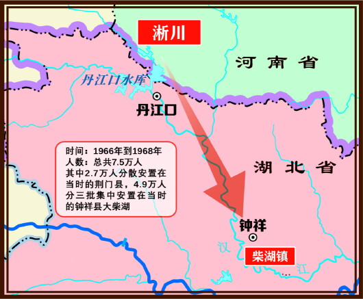 1967年丹江口大壩下閘蓄水。淅川縣是丹江口水庫重點淹沒區(qū)。從1966年到1968年,河南、湖北兩省共搬遷38萬人,淅川縣的移民占了20萬人。遷往湖北的淅川移民有7.5萬,其中,2.6萬人分散安置在當時的荊門縣,4.9萬人集中安置在當時的鐘祥縣大柴湖。