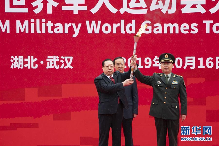 10月16日,第七屆世界軍人運(yùn)動(dòng)會(huì)組委會(huì)副主席黎火輝(前右)將點(diǎn)火棒交給湖北省人民政府省長王曉東(前左)。當(dāng)日,第七屆世界軍人運(yùn)動(dòng)會(huì)火炬?zhèn)鬟f活動(dòng)在武漢東湖綠道舉行。新華社記者 熊琦 攝