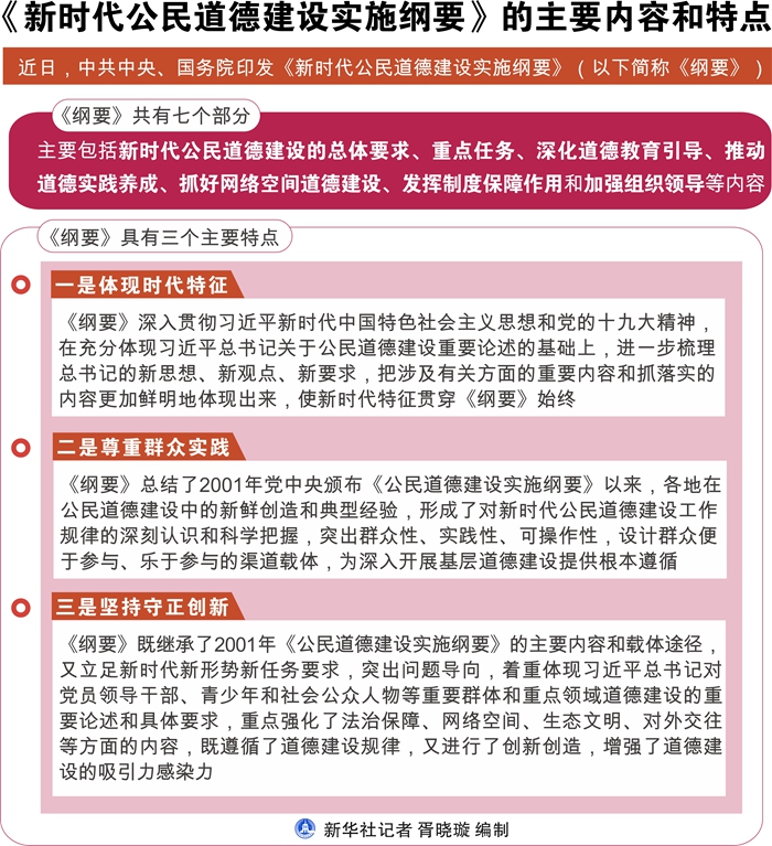 《綱要》具有三個(gè)主要特點(diǎn):一是體現(xiàn)時(shí)代特征?!毒V要》深入貫徹習(xí)近平新時(shí)代中國特色社會(huì)主義思想和黨的十九大精神,在充分體現(xiàn)習(xí)近平總書記關(guān)于公民道德建設(shè)重要論述的基礎(chǔ)上,進(jìn)一步梳理總書記的新思想、新觀點(diǎn)、新要求,把涉及有關(guān)方面的重要內(nèi)容和抓落實(shí)的內(nèi)容更加鮮明地體現(xiàn)出來,使新時(shí)代特征貫穿《綱要》始終。二是尊重群眾實(shí)踐。《綱要》總結(jié)了2001年黨中央頒布《公民道德建設(shè)實(shí)施綱要》以來,各地在公民道德建設(shè)中的新鮮創(chuàng)造和典型經(jīng)驗(yàn),形成了對新時(shí)代公民道德建設(shè)工作規(guī)律的深刻認(rèn)識和科學(xué)把握,突出群眾性、實(shí)踐性、可操作性,設(shè)計(jì)群眾便于參與、樂于參與的渠道載體,為深入開展基層道德建設(shè)提供根本遵循。三是堅(jiān)持守正創(chuàng)新?!毒V要》既繼承了2001年《公民道德建設(shè)實(shí)施綱要》的主要內(nèi)容和載體途徑,又立足新時(shí)代新形勢新任務(wù)要求,突出問題導(dǎo)向,著重體現(xiàn)習(xí)近平總書記對黨員領(lǐng)導(dǎo)干部、青少年和社會(huì)公眾人物等重要群體和重點(diǎn)領(lǐng)域道德建設(shè)的重要論述和具體要求,重點(diǎn)強(qiáng)化了法治保障、網(wǎng)絡(luò)空間、生態(tài)文明、對外交往等方面的內(nèi)容,既遵循了道德建設(shè)規(guī)律,又進(jìn)行了創(chuàng)新創(chuàng)造,增強(qiáng)了道德建設(shè)的吸引力感染力。