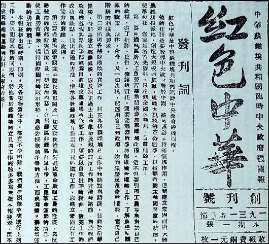 一個(gè)月后的12月11日,中華蘇維埃共和國(guó)臨時(shí)中央政府機(jī)關(guān)報(bào)《紅色中華》創(chuàng)刊。1932年2月4日起,《紅色中華》改為中國(guó)共產(chǎn)黨蘇區(qū)中央局、中國(guó)共產(chǎn)主義青年團(tuán)蘇區(qū)中央局、中華蘇維埃中央政府、全總蘇區(qū)執(zhí)行局合辦的中央機(jī)關(guān)報(bào)。