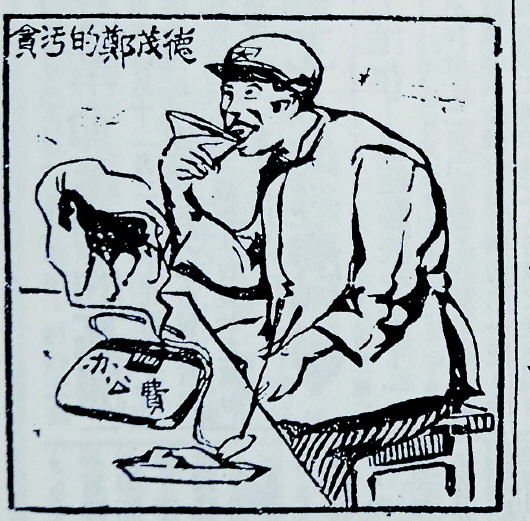 此事被揭露后,《紅色中華》在第134期發(fā)表了一幅《貪污分子鄭德茂》漫畫(huà),畫(huà)中戴著五角星帽子用“辦公費(fèi)”大吃大喝的鄭茂德,腦海里正想著一匹騾子,貪污分子的丑陋形象躍然紙上。