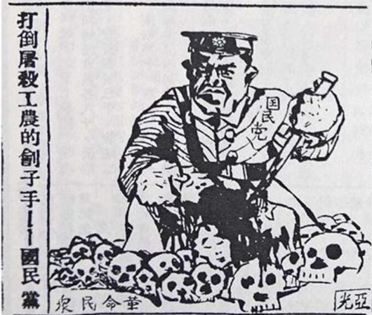 1933年7月14日,《紅色中華》第1版刊發(fā)潘漢年撰寫(xiě)的社論《反對(duì)國(guó)民黨法西斯的白色恐怖》,文章配發(fā)黃亞光創(chuàng)作的漫畫(huà)《打倒屠殺工農(nóng)的劊子手——國(guó)民黨》,畫(huà)面上的國(guó)民黨兇手舉著滴血的屠刀,踏著一堆革命群眾的尸骨,將國(guó)民黨反動(dòng)派與人民為敵的本性揭露無(wú)遺。