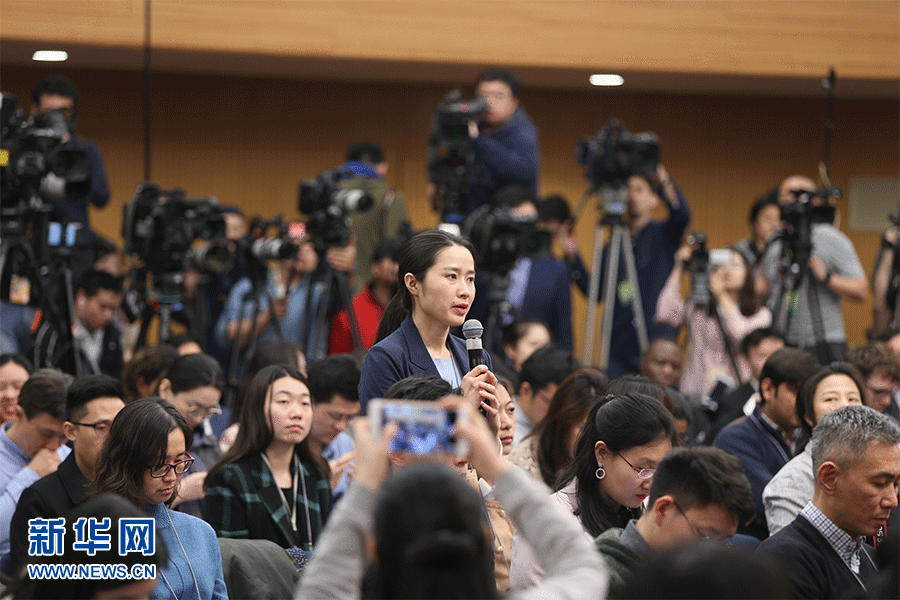 十三屆全國(guó)人大二次會(huì)議新聞中心3月9日(星期六)10時(shí)30分在梅地亞中心新聞發(fā)布廳舉行記者會(huì),邀請(qǐng)商務(wù)部部長(zhǎng)鐘山、副部長(zhǎng)兼國(guó)際貿(mào)易談判副代表王受文、副部長(zhǎng)錢(qián)克明就“促進(jìn)形成強(qiáng)大國(guó)內(nèi)市場(chǎng) 推動(dòng)全方位對(duì)外開(kāi)放”相關(guān)問(wèn)題回答中外記者提問(wèn)。圖為中央廣播電視總臺(tái)央視記者提問(wèn)。新華網(wǎng)/中國(guó)政府網(wǎng) 劉廈 攝