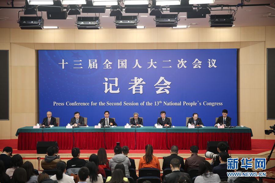 十三屆全國人大二次會議新聞中心3月9日在梅地亞中心新聞發(fā)布廳舉行記者會,邀請全國人大農(nóng)業(yè)與農(nóng)村委員會主任委員陳錫文、全國人大財政經(jīng)濟(jì)委員會副主任委員烏日圖、全國人大常委會法制工作委員會副主任劉俊臣、全國人大常委會法制工作委員會副主任許安標(biāo)、全國人大環(huán)境與資源保護(hù)委員會委員程立峰就“人大立法工作”相關(guān)問題回答記者提問。圖為記者會現(xiàn)場。新華網(wǎng)/中國政府網(wǎng) 劉廈 攝
