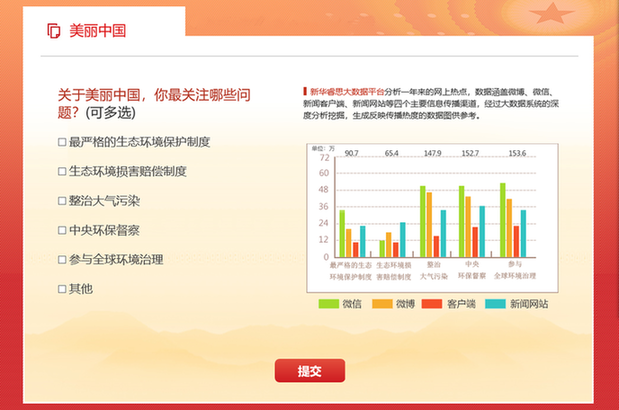 綠水青山是你我都關注的熱點。在新華網(wǎng)推出的2019全國兩會熱點調查中,新華睿思大數(shù)據(jù)通過監(jiān)測新聞網(wǎng)站、論壇、微信、微博、APP、平媒6個信源,分析結果顯示,全國兩會開幕以來,關于生態(tài)環(huán)境的話題共832 4987個。