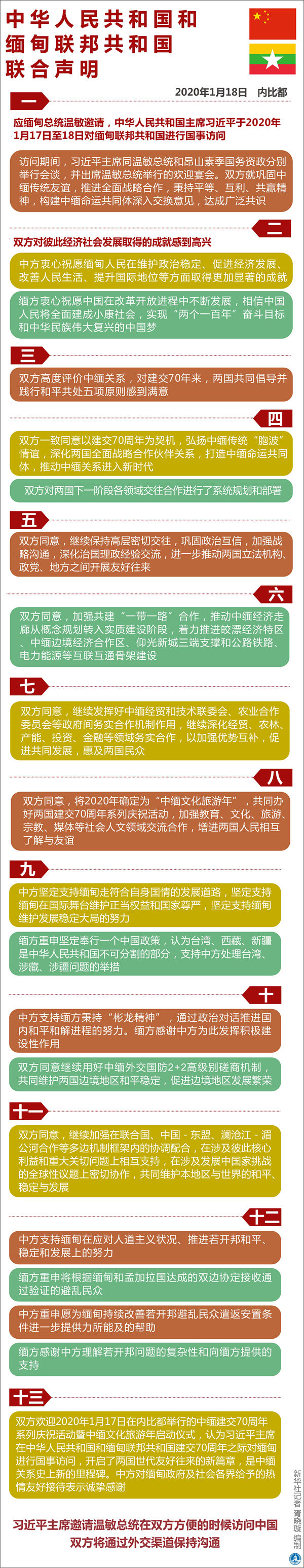 十三、雙方歡迎2020年1月17日在內(nèi)比都舉行的中緬建交70周年系列慶?;顒?dòng)暨中緬文化旅游年啟動(dòng)儀式,認(rèn)為習(xí)近平主席在中華人民共和國(guó)和緬甸聯(lián)邦共和國(guó)建交70周年之際對(duì)緬甸進(jìn)行國(guó)事訪問(wèn),開啟了兩國(guó)世代友好往來(lái)的新篇章,是中緬關(guān)系史上新的里程碑。中方對(duì)緬甸政府及社會(huì)各界給予的熱情友好接待表示誠(chéng)摯感謝。