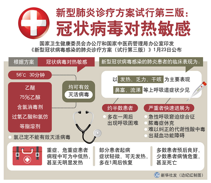 新華社北京1月23日電(記者田曉航、王秉陽)為進(jìn)一步指導(dǎo)全國科學(xué)規(guī)范做好新型冠狀病毒感染的肺炎病例診斷和醫(yī)療救治工作,在組織專家對(duì)診療方案進(jìn)行修訂基礎(chǔ)上,國家衛(wèi)生健康委員會(huì)辦公廳和國家中醫(yī)藥管理局辦公室印發(fā)《新型冠狀病毒感染的肺炎診療方案(試行第三版)》,23日公布。方案涉及冠狀病毒病原學(xué)特點(diǎn)、此次疫情的臨床特點(diǎn)、病例定義、鑒別診斷、病例的發(fā)現(xiàn)與報(bào)告等方面內(nèi)容,給出了包括中醫(yī)治療在內(nèi)的治療方案。