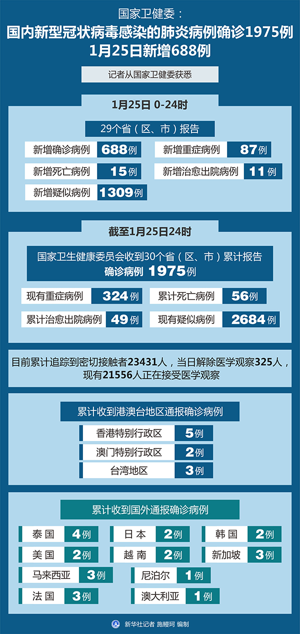圖表:國(guó)家衛(wèi)健委:國(guó)內(nèi)新型冠狀病毒感染的肺炎病例確診1975例 1月25日新增688例 新華社記者 施鰻珂 編制