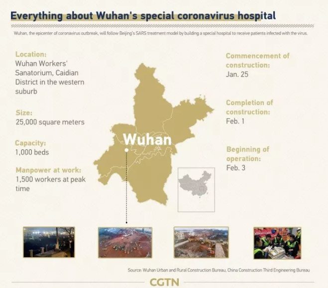 Construction began on the night of January 23 for a new specialized hospital for coronavirus patients in central China's Wuhan City. The hospital is designed to have an area of 25,000 square meters with 1,000 beds and will be put into use by February 3, officials said.