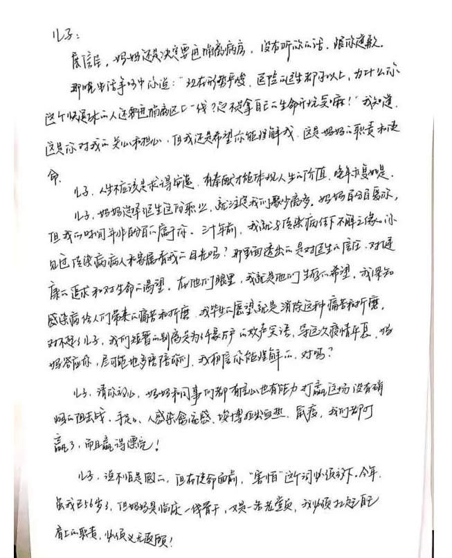 醫(yī)生曹曉英表示,這封信是在進(jìn)入隔離區(qū)前寫(xiě)下留給兒子的。整個(gè)醫(yī)療團(tuán)隊(duì)有24名醫(yī)生,30多名護(hù)士,也和她一樣,大家住在醫(yī)院,與家人分離。