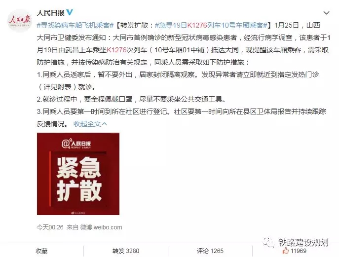 1月25日,山西大同市衛(wèi)健委發(fā)布通知:大同市首例確診的新型冠狀病毒感染患者,經(jīng)流行病學(xué)調(diào)查,該患者于1月19日由武昌上車乘坐K1276次列車(10號(hào)車廂01中鋪)抵達(dá)大同,現(xiàn)提醒該車廂乘客,需采取防護(hù)措施,并按傳染病防治有關(guān)規(guī)定,同乘人員需采取如下防護(hù)措施: 1、同乘人員返家后,暫不要外出,居家封閉隔離觀察。發(fā)現(xiàn)異常者請(qǐng)立即就近到指定發(fā)熱門診(詳見附表)就診。 2、就診過程中,要全程佩戴口罩,盡量不要乘坐公共交通工具。 3、同乘人員要第一時(shí)間到所在社區(qū)進(jìn)行登記。社區(qū)要第一時(shí)間向所在縣區(qū)衛(wèi)體局報(bào)告并持續(xù)跟蹤反饋情況。