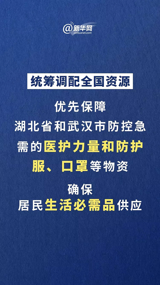 會(huì)議強(qiáng)調(diào),要突出重點(diǎn),進(jìn)一步加強(qiáng)湖北省和武漢市疫情防控。中央向湖北派出指導(dǎo)組,推動(dòng)加強(qiáng)防控一線工作。統(tǒng)籌調(diào)配全國資源,優(yōu)先保障湖北省和武漢市防控急需的醫(yī)護(hù)力量和防護(hù)服、口罩等物資,確保居民生活必需品供應(yīng),物資調(diào)運(yùn)實(shí)行綠色通道。湖北省和武漢市要層層落實(shí)責(zé)任,加快建設(shè)集中收治醫(yī)院、改造酒店作為隔離區(qū),做好發(fā)熱病人及時(shí)診治,防范發(fā)生次生問題。加強(qiáng)醫(yī)護(hù)人員輪換和防護(hù),緩解他們的身體和心理壓力。嚴(yán)格做好城鄉(xiāng)結(jié)合部、省市邊界人流進(jìn)出管理,做到外防輸出、內(nèi)防擴(kuò)散。