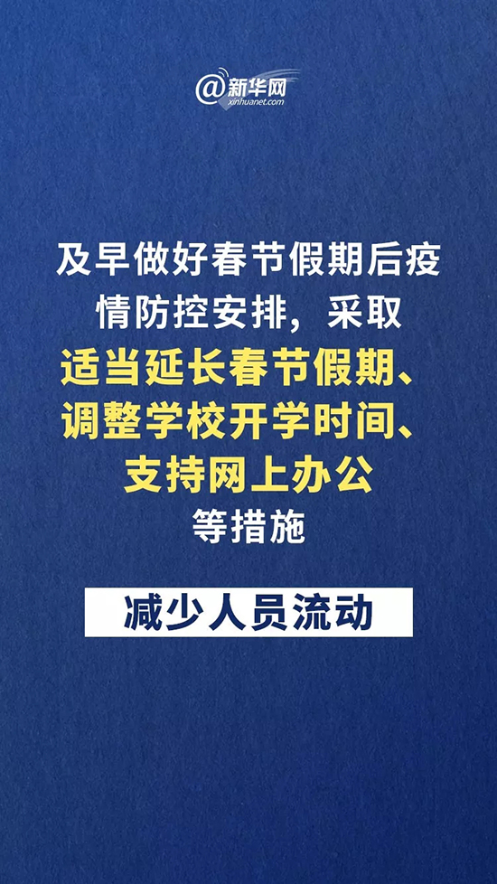 會(huì)議要求,要加強(qiáng)分類指導(dǎo),壓實(shí)屬地責(zé)任,精準(zhǔn)有效科學(xué)防控。各地要成立應(yīng)對(duì)疫情工作領(lǐng)導(dǎo)小組,黨政主要負(fù)責(zé)人要親自掛帥,防控工作不得有誤。加強(qiáng)疫情監(jiān)測,嚴(yán)格隔離確診患者,對(duì)疑似病例和密切接觸者要按醫(yī)學(xué)要求進(jìn)行隔離和檢查。發(fā)病人數(shù)較多城市要抓緊增加定點(diǎn)醫(yī)院、治療床位和隔離點(diǎn)。推遲、減少會(huì)議和大型活動(dòng)。落實(shí)公共場所和交通工具檢控措施。農(nóng)村醫(yī)療衛(wèi)生條件薄弱,農(nóng)民工大批返鄉(xiāng),要高度重視農(nóng)村疫情防控,充分發(fā)揮基層組織和村醫(yī)作用,強(qiáng)化群防群控。及早做好春節(jié)假期后疫情防控安排,采取適當(dāng)延長春節(jié)假期、調(diào)整學(xué)校開學(xué)時(shí)間、支持網(wǎng)上辦公等措施,減少人員流動(dòng)。嚴(yán)厲打擊防控物資囤積居奇等行為。各級(jí)財(cái)政要充分保障疫情防控、患者救治等經(jīng)費(fèi)。