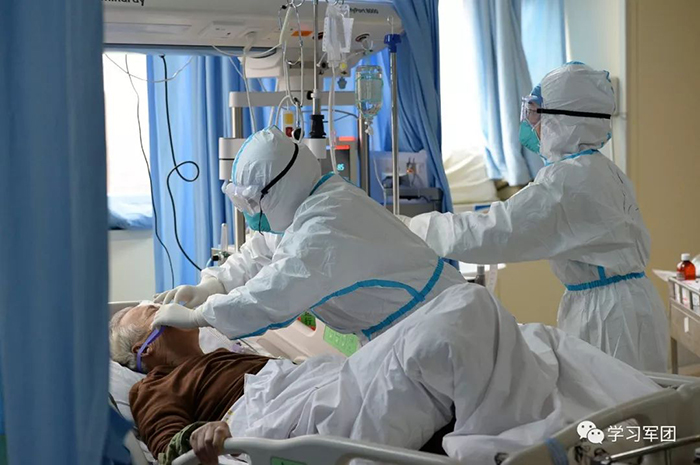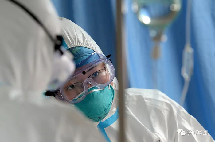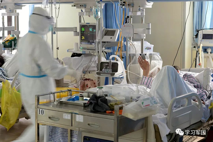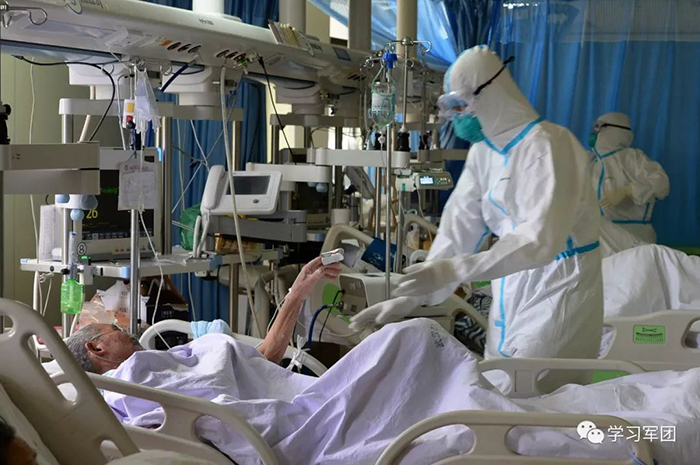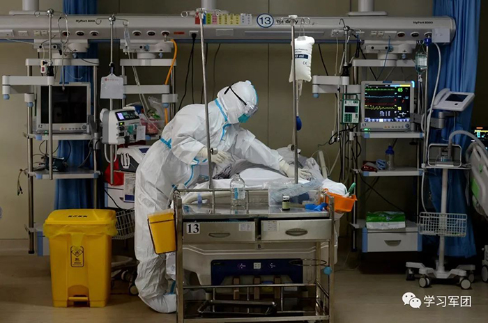 1月27日上午,海軍軍醫(yī)大學(xué)醫(yī)療隊醫(yī)護(hù)人員在漢口醫(yī)院重癥監(jiān)護(hù)室對新型冠狀病毒感染的肺炎患者進(jìn)行救治。醫(yī)護(hù)人員加強巡視,觀察輸液滴數(shù)。解放軍報記者范顯海攝