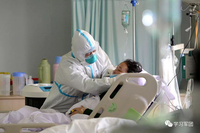 1月27日上午,海軍軍醫(yī)大學(xué)醫(yī)療隊醫(yī)護(hù)人員在漢口醫(yī)院重癥監(jiān)護(hù)室對新型冠狀病毒感染的肺炎患者進(jìn)行救治。醫(yī)護(hù)人員耐心安撫患者。解放軍報記者范顯海攝