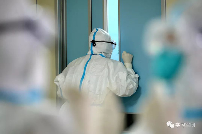 1月27日上午,海軍軍醫(yī)大學(xué)醫(yī)療隊醫(yī)護(hù)人員在漢口醫(yī)院重癥監(jiān)護(hù)室對新型冠狀病毒感染的肺炎患者進(jìn)行救治。醫(yī)護(hù)人員與監(jiān)護(hù)室外人員隔門交流。解放軍報記者范顯海攝