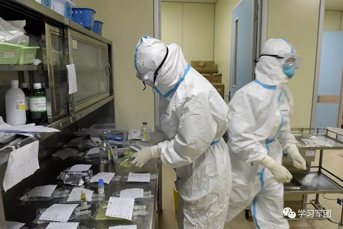 1月27日上午,海軍軍醫(yī)大學(xué)醫(yī)療隊醫(yī)護(hù)人員在漢口醫(yī)院重癥監(jiān)護(hù)室對新型冠狀病毒感染的肺炎患者進(jìn)行救治。醫(yī)護(hù)人員配備藥品。解放軍報記者范顯海攝