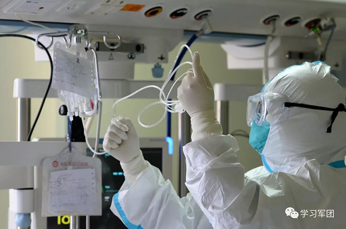 1月27日上午,海軍軍醫(yī)大學(xué)醫(yī)療隊醫(yī)護(hù)人員在漢口醫(yī)院重癥監(jiān)護(hù)室對新型冠狀病毒感染的肺炎患者進(jìn)行救治。醫(yī)護(hù)人員查看患者輸液導(dǎo)管是否通暢。解放軍報記者范顯海攝