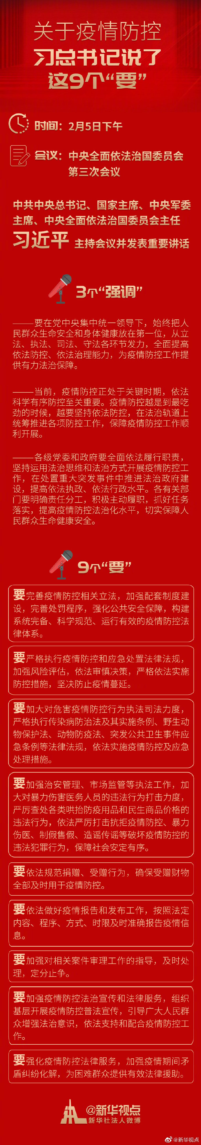2月5日下午,中共中央總書記、國家主席、中央軍委主席、中央全面依法治國委員會主任習(xí)近平主持召開中央全面依法治國委員會第三次會議強(qiáng)調(diào),全面提高依法防控依法治理能力,為疫情防控提供有力法治保障。