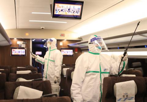 2月4日,中國鐵路北京局集團(tuán)有限公司對(duì)返回北京動(dòng)車段的復(fù)興號(hào)進(jìn)行車內(nèi)消毒作業(yè)。張晴/攝