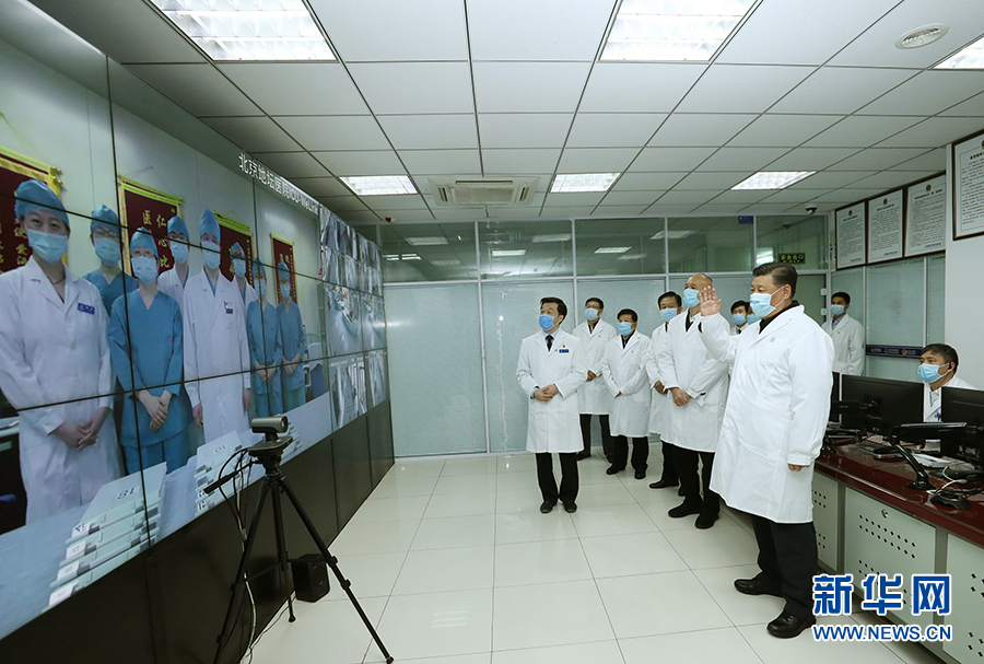 2月10日,中共中央總書記、國家主席、中央軍委主席習近平在北京調(diào)研指導新冠肺炎疫情防控工作。這是習近平來到首都醫(yī)科大學附屬北京地壇醫(yī)院門診樓一層運行監(jiān)控中心,通過監(jiān)控畫面察看患者住院診療情況,并視頻連線正在病房值班的醫(yī)務人員。 新華社記者 鞠鵬 攝
