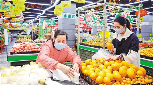 2月10日,市民在江西省宜豐縣華聯(lián)超市選購水果。連日來,該縣加強物資統(tǒng)籌調配,確保物價穩(wěn)定。 何賤來攝(中經視覺)