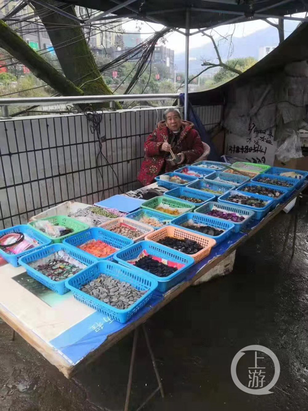倪素英老人原本在萬(wàn)新農(nóng)貿(mào)市場(chǎng)門(mén)口擺攤,賣(mài)紐扣、針線、鞋墊一類的百貨用品。