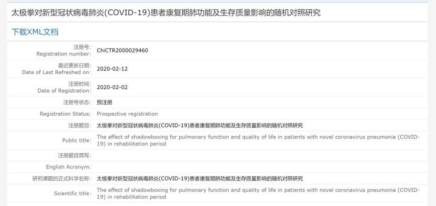 近日,記者用“新型冠狀病毒肺炎”等關(guān)鍵詞,在中國(guó)臨床試驗(yàn)注冊(cè)中心查詢發(fā)現(xiàn),截至2月12日已有60項(xiàng)符合檢索條件的試驗(yàn)。這些臨床試驗(yàn)內(nèi)容非常廣泛,既包括多種西藥、干細(xì)胞、中藥、重要注射劑,還包括社區(qū)干預(yù)療法等。令記者沒想到的是,其中竟然還有一項(xiàng)預(yù)注冊(cè)方案,準(zhǔn)備研究太極拳對(duì)患者康復(fù)期肺功能及生存質(zhì)量的影響。