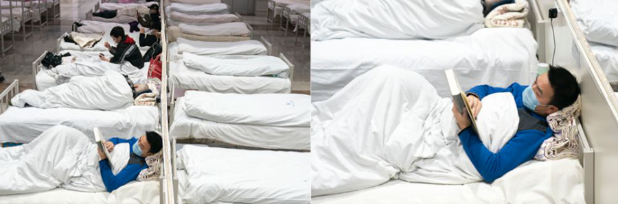 這些身影中還有被隔離的病人。江漢方艙醫(yī)院啟用的第一天,收治的首批病人里,有一個面目清秀的小伙子。入院躺下后,他打開了一本《政治秩序的起源》,安靜地閱讀??谡终谧×怂谋砬?,但卻藏不住眼神里的平靜和專注??匆娢遗e起相機,他輕輕擺了擺手,示意不用拍他,我猶豫片刻,還是執(zhí)意按下了快門。也許他并不明白,在有些喧囂的方艙醫(yī)院里,近乎靜止的他,是多么的令人震撼。