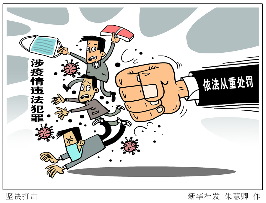 執(zhí)法司法的鐵面莊嚴,彰顯庇佑民生的溫情。在疫情防控期間實施有關(guān)違法犯罪的,政法機關(guān)作為從重情節(jié)予以考量,依法體現(xiàn)從嚴的政策要求。 疫情發(fā)生以來,全國公安機關(guān)查處擾亂社會秩序類案件377起,干擾疫情防控類案件83起,妨害公務(wù)類案件55起;破獲非法獵捕珍貴野生動物、非法狩獵等刑事案件19起,抓獲犯罪嫌疑人29名;破獲涉疫情詐騙案件1116起,抓獲犯罪嫌疑人294名,追繳贓款660余萬元…… 新華社發(fā) 朱慧卿 作