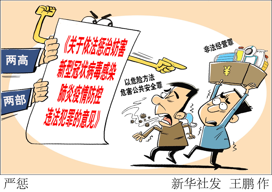 2月10日,最高人民法院、最高人民檢察院、公安部、司法部聯(lián)合發(fā)布關(guān)于依法懲治妨害新型冠狀病毒感染肺炎疫情防控違法犯罪的意見,針對當前突出的涉疫情防控違法犯罪,統(tǒng)一執(zhí)法標準、程序、依據(jù),并強調(diào)加強治安管理、市場監(jiān)管等執(zhí)法工作,加大對暴力傷醫(yī)違法犯罪行為打擊力度。 新華社發(fā) 王鵬 作