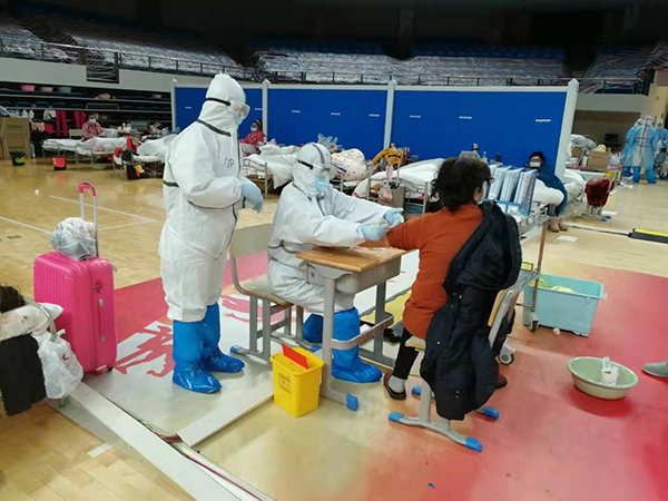 漢江方艙醫(yī)院內,醫(yī)護人員為患者做檢查。
