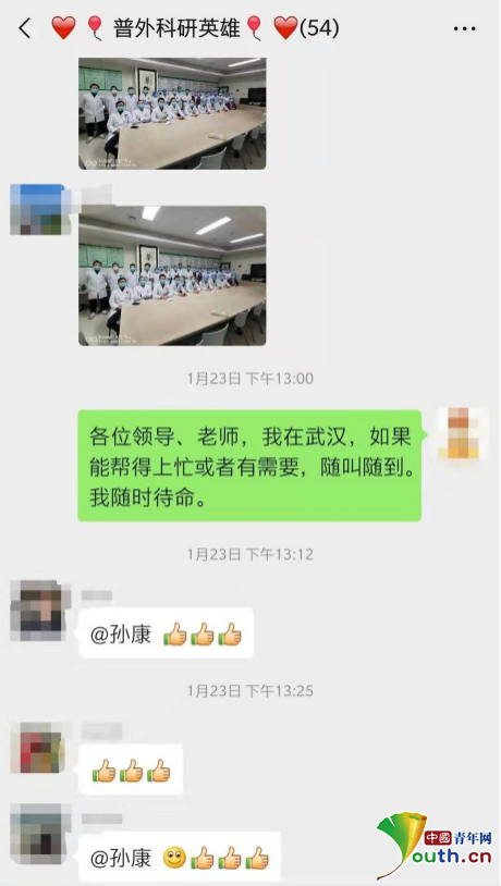 1月23日,看著老師奮戰(zhàn)在抗疫一線,他便主動請求上“戰(zhàn)場”。不過,由于他的專業(yè)是外科,因此未被選中。1月24日,孫康在工作群里又得到通知,“醫(yī)院可能抽組醫(yī)療隊支援地方,進行報名登記”。他便立即二次“請戰(zhàn)”。