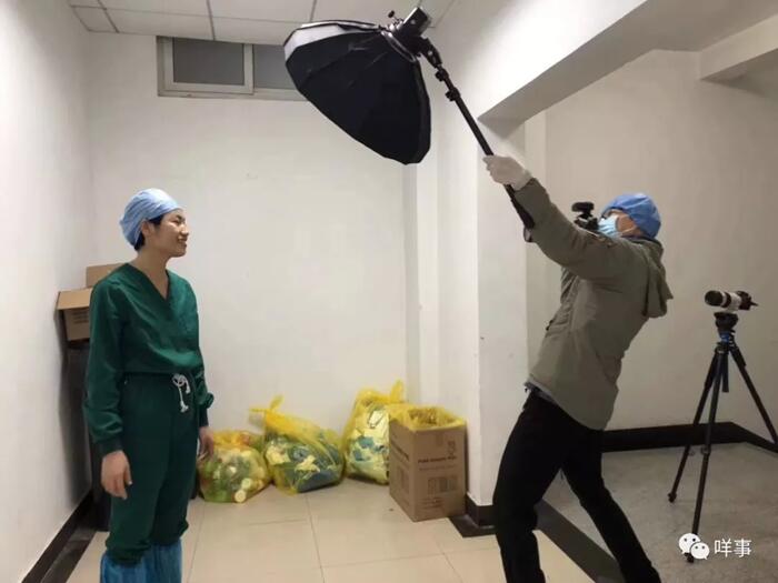 鐘銳鈞說(shuō),在拍攝的兩天內(nèi),他一直守在漢口醫(yī)院的隔離區(qū)外,等到醫(yī)護(hù)人員出門(mén)便走上前去,讓每個(gè)人只停留一分鐘,一手舉燈一手持相機(jī)完成拍攝。