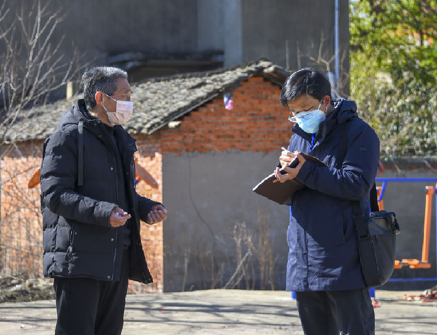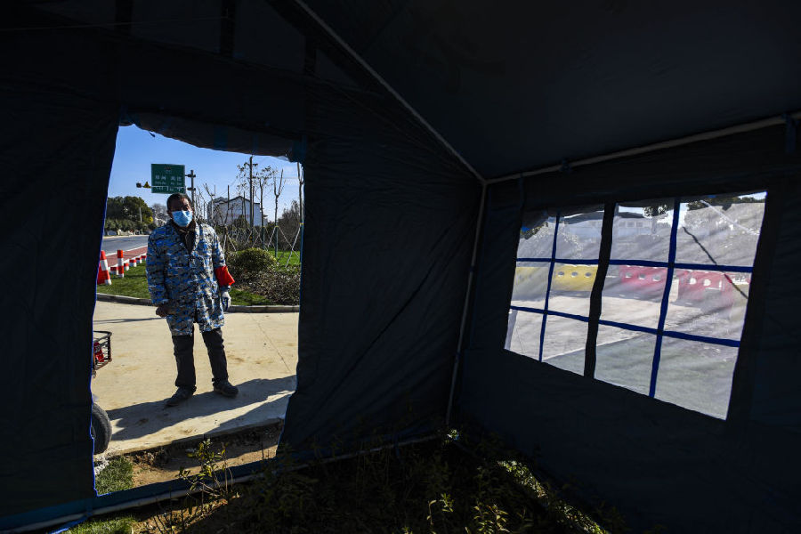 浐川村民秦如康在一條通村道路口值守。新華社記者 胡虎虎 攝