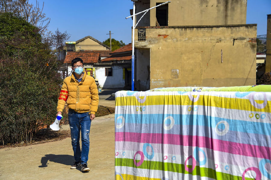 志愿者程浩在村莊來回播放錄音,提示村民注意防護。新華社記者 胡虎虎 攝
