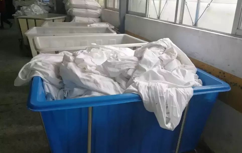 每趟列車到達(dá)終點(diǎn)站后,臥具都會(huì)重新更換,拆卸下的臥具由專人運(yùn)送至洗滌消毒中心。被套、枕套、床單等分別放在不同的待洗推車?yán)?,工作人員會(huì)根據(jù)臥具的種類、污漬程度進(jìn)行分揀。