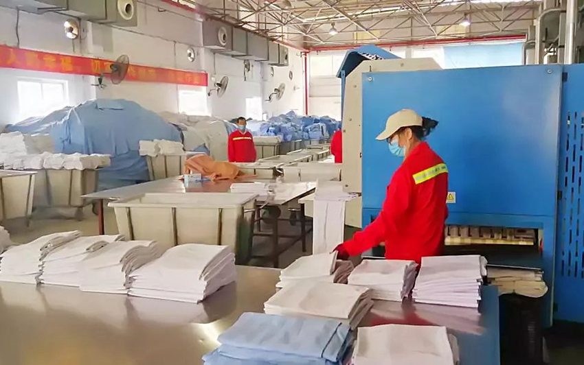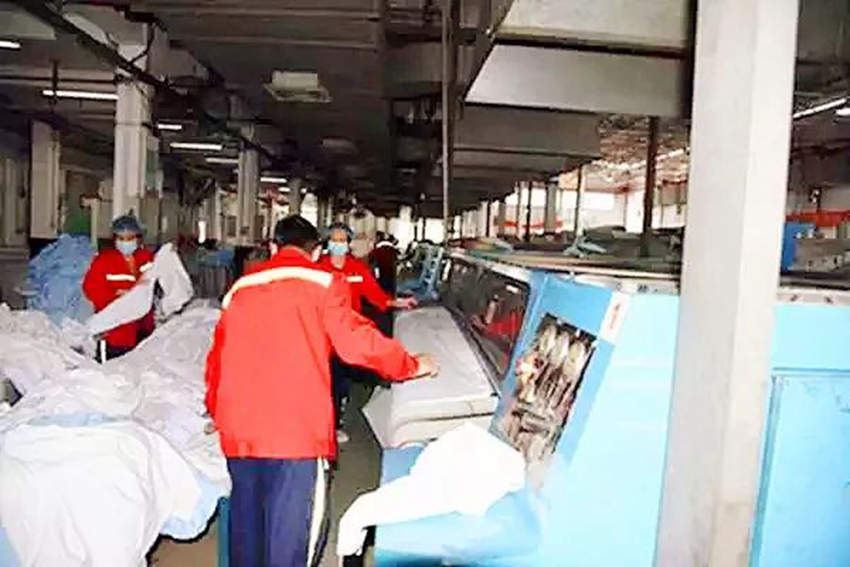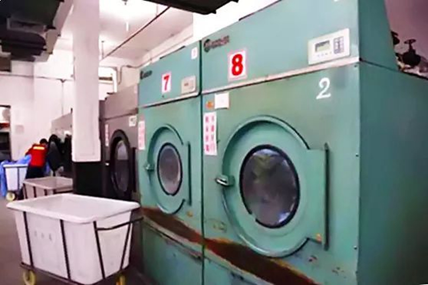 洗滌后的臥具會(huì)被放入烘干機(jī)內(nèi)烘干,然后工作人員將臥具用高溫熨燙機(jī)進(jìn)行最后的處理:一方面熨燙臥具至平整,另一方面可以進(jìn)一步高溫消毒。