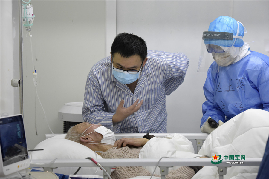 在病房,萬先生當(dāng)“翻譯”,幫助醫(yī)護(hù)人員和只會(huì)講方言的老年患者交流。中國軍網(wǎng)記者范顯海 攝