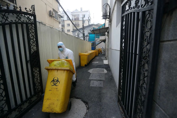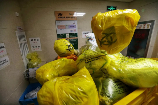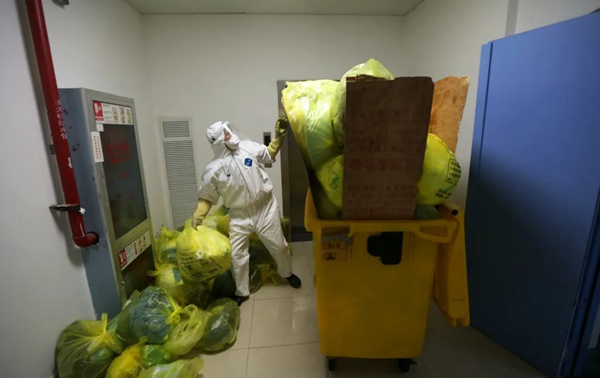 同濟(jì)中法新城醫(yī)院的醫(yī)療廢棄物原本放在醫(yī)院地下室的暫存間,使用紅外線和藥水進(jìn)行消毒,但是隨著新冠肺炎疫情的到來,產(chǎn)生的醫(yī)療廢棄物是以前的近十倍,而且都是感染性的醫(yī)療廢棄物?!耙郧拔覀兊尼t(yī)療廢棄物放在垃圾桶里都會(huì)把垃圾桶蓋子蓋上,但是現(xiàn)在醫(yī)療廢棄物實(shí)在太多了,不僅蓋子蓋不上,我們還要把垃圾硬塞進(jìn)垃圾箱,有時(shí)候裝有醫(yī)療廢棄物的垃圾袋受擠壓會(huì)突然炸開,嚴(yán)重威脅我們醫(yī)療廢物處理人員的安全,但是為了盡快收完垃圾,確保院區(qū)所有人的安全,我們只能不惜一切代價(jià)了?!?另一位負(fù)責(zé)醫(yī)療廢棄物的處理工作的周師傅稱。