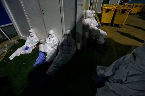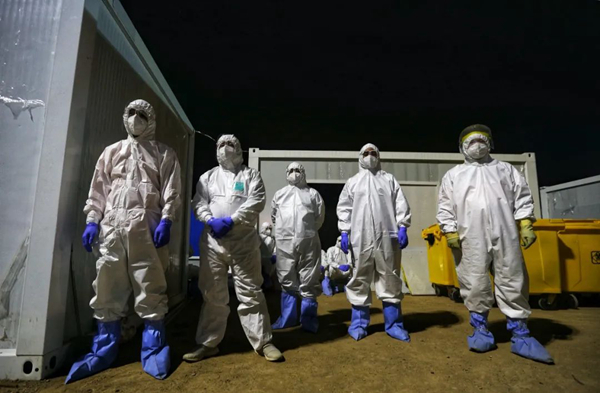 雷神山醫(yī)院負(fù)責(zé)處置清運(yùn)醫(yī)療廢物的志愿者們(攝影:崔萌)