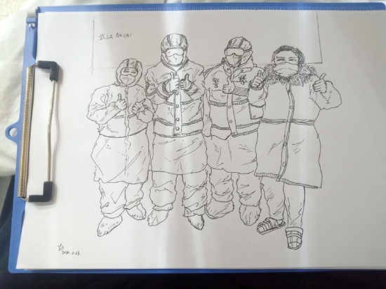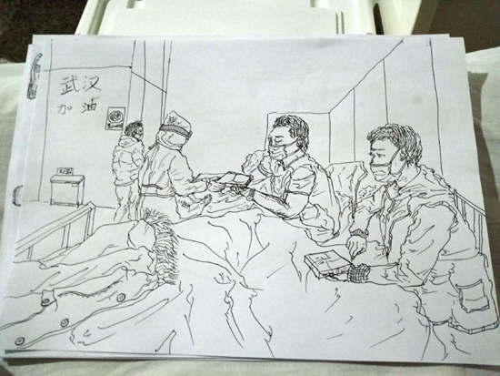 他把畫的“方艙生活”發(fā)到了微博上——兩位病人在床,護(hù)士俯身照顧。畫中醫(yī)院的墻上被他特意寫了四個(gè)字:“武漢加油?!保ǔ堂顺?/p>