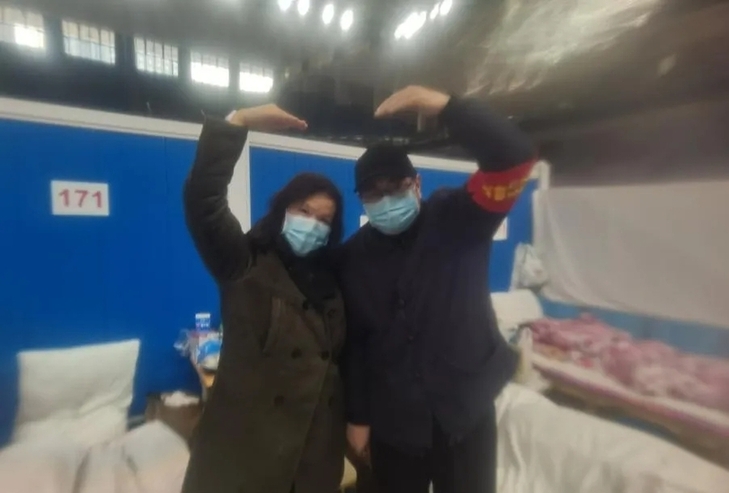 人民網(wǎng)湖北頻道記者張嬋為洪山體育館武昌方艙醫(yī)院的患者拍合影。